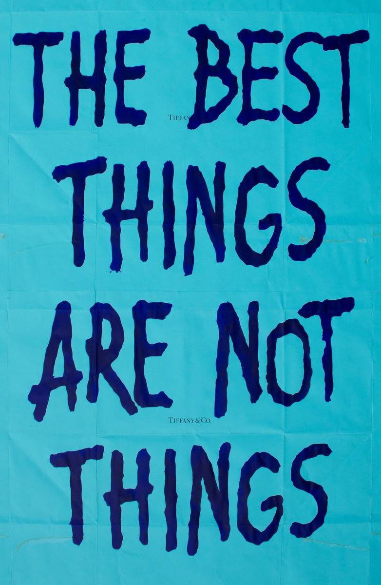 In mostra presso KROMYA Art Gallery, circa trenta opere tra soggetti nuovi e già conosciuti, come la nota scritta in acrilico sui sacchetti à pois Louis Vuitton: The Best Things Are Not Things (Le cose migliori non sono cose) oppure l’opera cult sulle shoppers arancio Hermès: Love didn’t meet her at her best / it met her in Her mèss (L’amore non l’ha incontrata al suo meglio / l’ha incontrata nel suo caos - in Hermès), nata nel 2019 da una foto scattata all’ingresso del cantiere del negozio in via Monte Napoleone a cui Terzini aggiunse la scritta con Photoshop.
