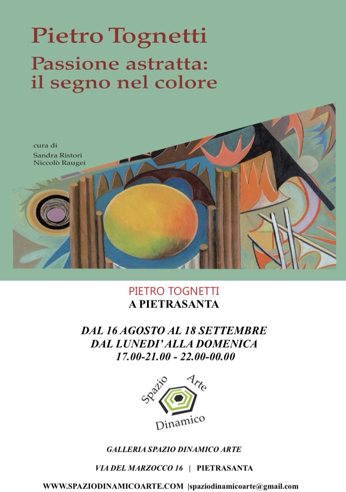 Dopo il successo della mostra a Empoli le opere più rappresentative dell’artista Pietro Tognetti vengono riproposte presso lo spazio espositivo di Pietrasanta della Galleria Spazio Dinamico Arte in via del Marzocco 16 . L’evento comprende la presentazione della monografia dell’artista