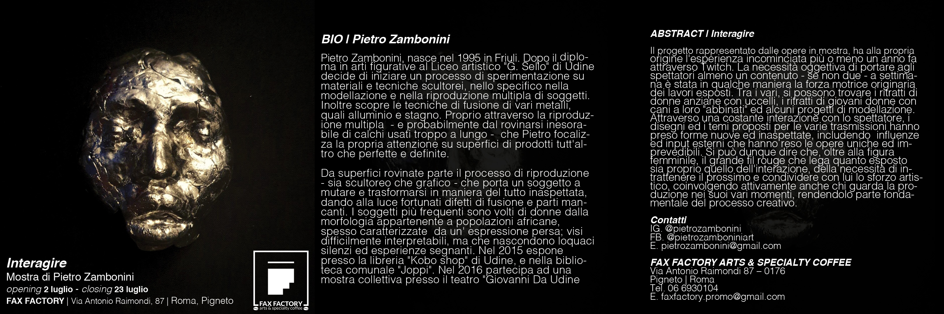 Pietro Zambonini, nato nel 1995 in Friuli. Dopo il diploma in arti figurative al Liceo artistico "G. Sello" di Udine decide di iniziare un processo di sperimentazione su materiali e tecniche scultorei, nello specifico nella modellazione e nella riproduzione multipla di soggetti. Inoltre scopre le tecniche di fusione di vari metalli, quali alluminio e stagno. Proprio attraverso la riproduzione multipla - e probabilmente dal rovinarsi inesorabile di calchi usati troppo a lungo - che Pietro focalizza la propria attenzione su superfici di prodotti tutt'altro che perfette e definite. Da superfici rovinate parte il processo di riproduzione - sia scultoreo che grafico - che porta un soggetto a mutare e trasformarsi in maniera del tutto inaspettata, dando alla luce fortunati difetti di fusione e parti mancanti. I soggetti più frequenti sono volti di donne dalla morfologia appartenente a popolazioni africane, spesso caratterizzate da un' espressione persa; visi difficilmente interpretabili, ma che nascondono loquaci silenzi ed esperienze segnanti. Nel 2015 espone presso la libreria “Kobo shop” di Udine, e nella biblioteca comunale “Joppi”. Nel 2016 partecipa ad una mostra collettiva presso il teatro “Giovanni Da Udine”.