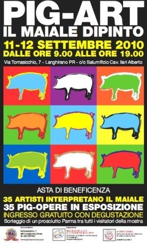 in mostra 35 opere di altrettanti artisti che, con diverse tecniche pittoriche, interpretano il maiale. Le opere verranno messe all’asta e il ricavato verrà devoluto alle seguenti associazioni: – Associazione per la lotta all’ictus cerebrale di Parma – Centro per lo studio del trattamento dello scompenso cardiaco di Brescia.