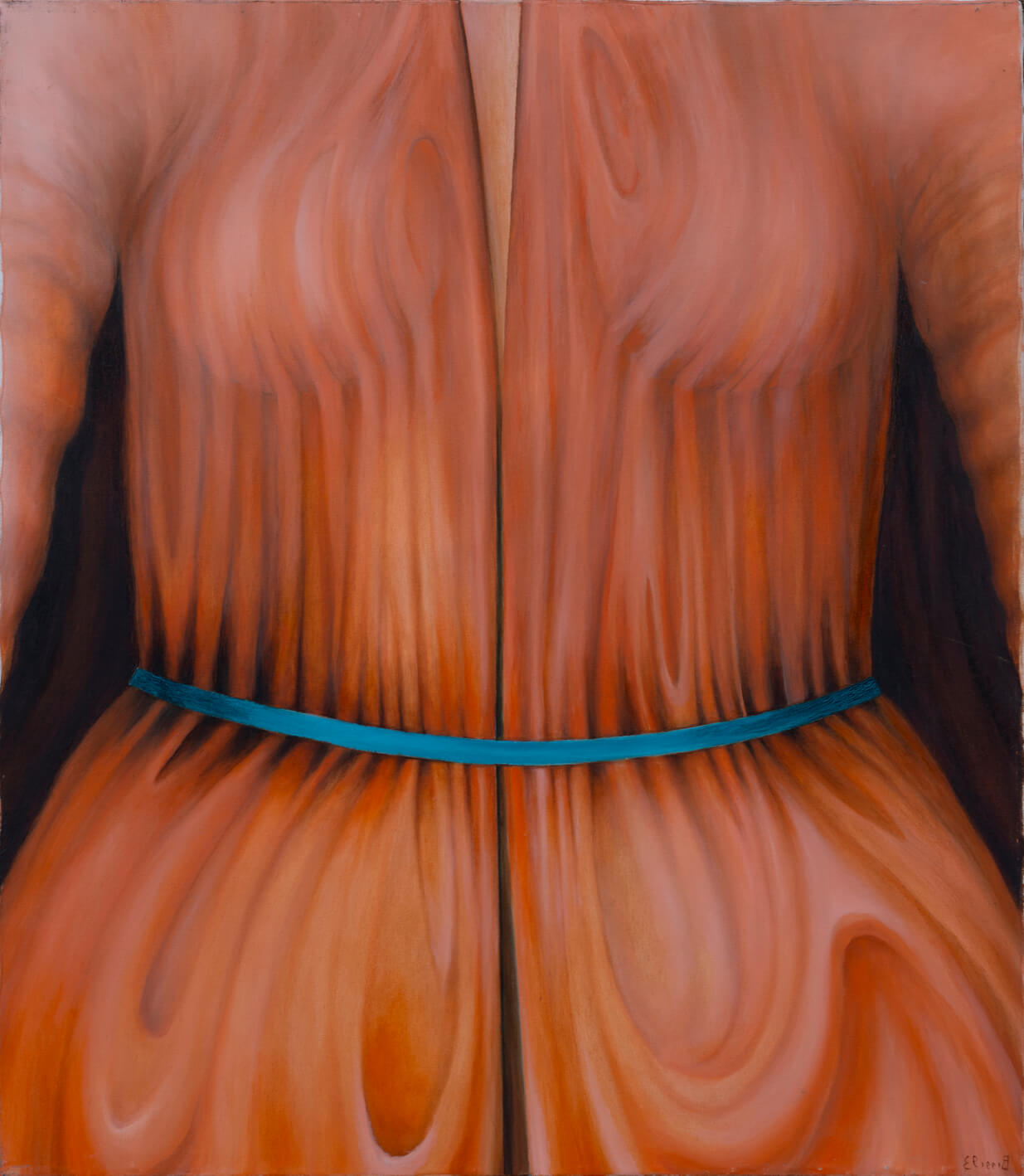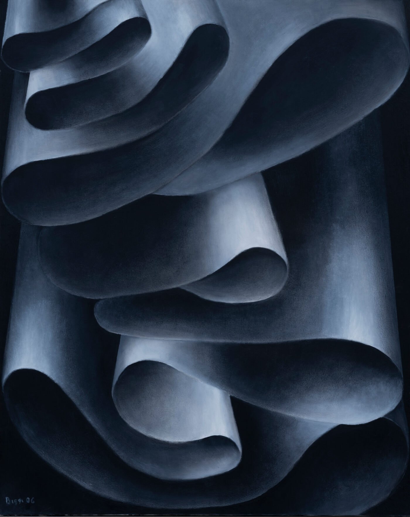 Tipico del lavoro di Pino Biggi è la messa a fuoco dei particolari attraverso una sorta di mosaico lenticolare, come si legge in una dichiarazione dello stesso autore: “Ciò che consideriamo figurativo nelle varie epoche storiche della pittura lo è stato solo relativamente al volto, mentre il panneggio delle vesti può essere considerato spesso una composizione astratta”. Così ondeggiano le pieghe dei nastri colorati e i panneggi sui corpi velati, personalissima e superba reminiscenza di Biggi del gotico fiammeggiante.