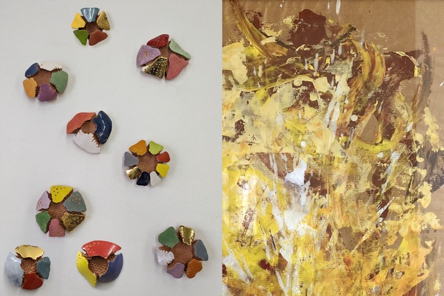 Esposte in galleria potremo ammirare coloratissime sculture a petali di fiore di Pino Di Gennaro, dove ogni impollinatore ha lasciato traccia di sé, insieme alle carte dipinte di Tiziana Priori: un favo colmo di miele, o “ Il volo nuziale ” di un’ ape regina che permette che la specie continui, laddove le “Api-Ninfe” rappresentano le divinità che proteggono le api e il grande dipinto a larghe pennellate su carta giapponese suggerisce un “Cielo di Città” da cui uno sciame d’api prende il volo. Opere in cartapesta e bronzo di Di Gennaro alludono a percorsi in ascesa immaginari nel luminoso cielo blu, e “Le case delle api” sono piccole sculture in bronzo, un riparo perché “prendersi cura di loro è prendersi cura di noi: nessuno si salva da solo” - con le parole dell’artista.