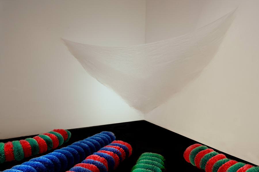 Non saprei dire perché ho aspettato tanto. Che Pino non ritenesse fosse arrivato il momento giusto? Finalmente, vinte le ultime perplessità, lo scorso settembre a Polignano, paese natale di Pascali, nella Fondazione a lui intitolata, ho rispolverato dopo quarantacinque anni i cinque bachi da setola assieme alla ragnatela. Ma è veramente una ragnatela? mi sono chiesto in corso d'opera. Inequivocabilmente lo è, visto il suo posizionamento sul muro, ma a mio avviso è soprattutto un bozzolo. La sua trama, via via che Claudio Palmieri l'andava ricreando sulla parete, una volta assimilata e perfezionata la tecnica pascaliana, mi è parsa più consona a un bozzolo, ispessita com'è da numerosi passaggi di tessitura, che a una ragnatela, la quale ha nella trasparenza il punto di forza della sua trappola. In questo caso la consistenza dell'involucro ha piuttosto le caratteristiche di cova, di nido, di rifugio. La ragnatela, sinonimo di morte, il bozzolo, di vita che rinasce. Entrambi gli aspetti, ne sono convinto, coesistono in questo lavoro di Pascali.