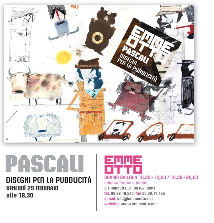 In esposizione una ricca raccolta di materiali che testimoniano l'inclinazione al gioco del loro autore, la sua raffinata ironia, la fantasia esplosiva appaiata al rigore pignolo del professionista che nulla concede all'improvvisazione e infine quella sua celebrata manualità posta al servizio di un raro talento progettuale. Ci sono i disegni, su carta o acetato, i collages e i fotomontaggi che preparavano i filmati e poi i filmati stessi: gli spot pubblicitari che alle otto e mezza di sera inchiodavano le famiglie italiane di fronte a Carosello, ma anche certi spot veramente originali commissionati dalla Rai per autopromuoversi; le sigle di programmi famosi (TV7), o dei primi contenitori di pubblicità televisiva alternativi a Carosello (Intermezzo) e persino alcuni esempi di spot per il cinema, ancora più inventivi di quelli realizzati per la TV. Un posto di rilievo è stato giustamente assegnato ai progetti rifiutati dai clienti perché troppo innovativi, ad esempio il cartone animato dei Killers, i piccoli gangsters cui la Algida, affezionata madrina delle creaturine di Pascali dal '61, non volle affidare le sorti commerciali del suo listino gelati del '67. La carrellata delle trovate iconografiche, delle tecniche e dei materiali utilizzati è insomma inesauribile e si stenta a credere che una creatività così debordante riesca a conciliarsi con una ricerca stilistica di sintesi estrema: la grafica pascaliana è essenziale e di leggibilità immediata.