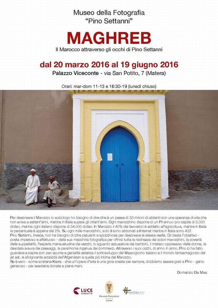 E proprio in questi giorni una mostra omaggia l’occhio viaggiatore di Settanni. A Matera, Capitale europea della Cultura per il 2019, lo scorso anno ha inaugurato il Museo della Fotografia, intitolato a Pino Settanni. Domenica 20 marzo 2016 il Museo della Fotografia, con sede in Palazzo Viceconte (via San Potito, 7), inaugurerà l’esposizione ‘Maghreb – Il Marocco attraverso gli occhi di Pino Settanni’, raccolta di splendidi scatti promossa anche da Luce-Cinecittà, ospitata fino al 19 giugno. Un’occasione per conoscere l’antropologia creativa di questo artista, che in anni recenti ha ritrovato in Marocco la bellezza del suo Meridione italiano degli anni ’60, con i colori brillanti e la fantasia delle sue più recenti sperimentazioni.