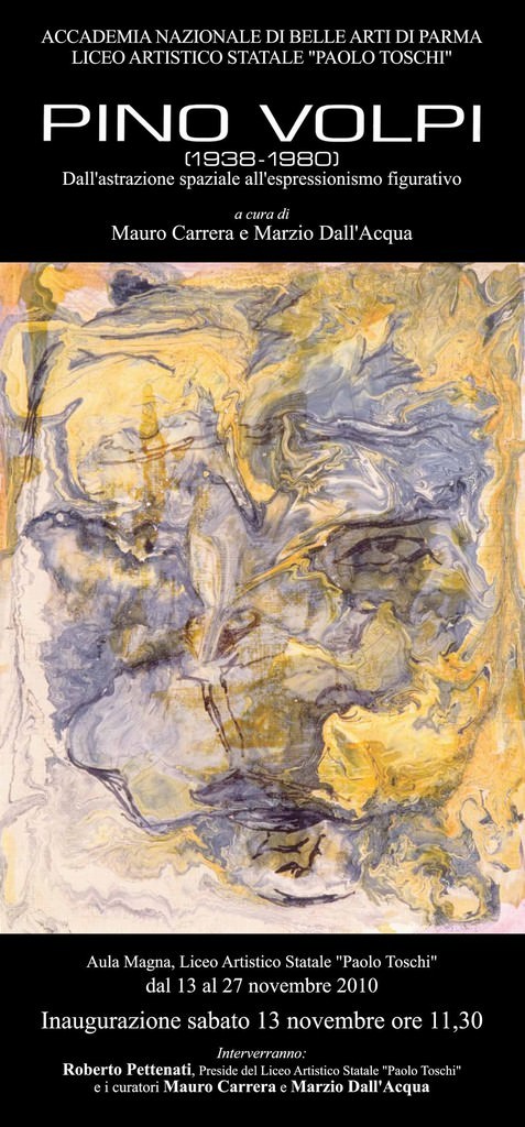Dal 13 novembre al 27 2010 presso l’Aula Magna del Liceo Artistico Statale “Paolo Toschi” di Parma si tiene l’esposizione “Pino Volpi (1938-1980) Dall’astrazione spaziale all’espressionismo figurativo”. In occasione dei 30 anni dalla morte dell’artista, l’Accademia Nazionale di Belle Arti di Parma e il Liceo Artistico Statale “Paolo Toschi” hanno deciso di celebrare la ricorrenza organizzando un’esposizione – a cura di Mauro Carrera e Marzio Dall’Acqua – che testimonia dell’intero percorso del pittore, figura di spicco della scena artistica milanese degli anni Settanta, precocemente scomparso all’età di 42 anni.