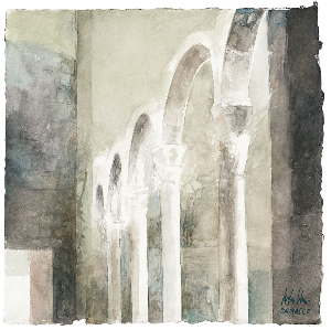 I suoi pennelli indagano la superficie della carta con familiarità, con moto apparentemente casuale, alla ricerca dei punti e dei piani dove la luce incrocia l’essenza più intima, evidenziando la complessità dei volumi, rilevando persino le stratificazioni che il tempo implacabile ha imposto alle architetture e alla vita stessa scorsa di quei luoghi.