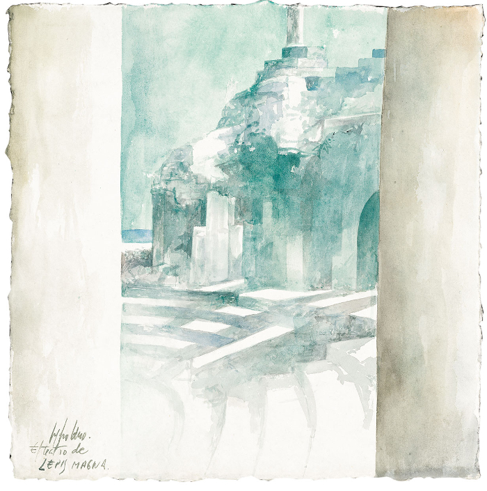 Con pennellate mai prodighe di dettagli, nelle colonne o sulle facciate appena accennate, trasferisce non solo l’essenza architettonica, la sua plasticità e la sua austera severità ma anche, e soprattutto, le trepidazioni e le suggestioni avverte giungendo in quei luoghi.