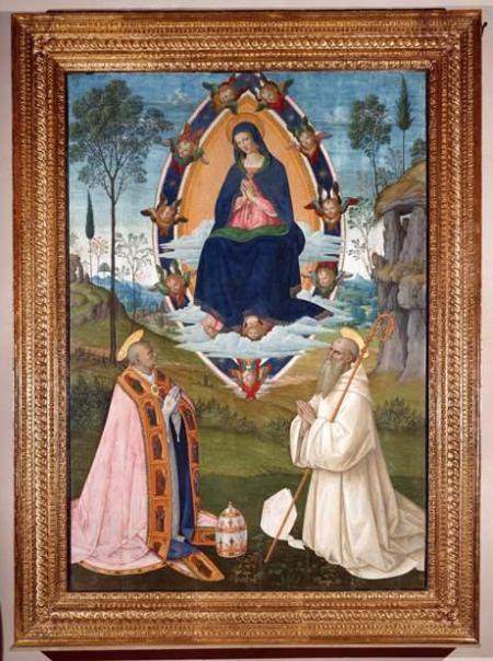 La pala che raffigura ai lati della Madonna in gloria i santi Gregorio Magno e Benedetto, fu dipinta tra l’ottobre 1510 e il febbraio 1512 per il monastero olivetano di Santa Maria Assunta a Barbiano, a pochi chilometri da San Gimignano e rappresenta l’ultima opera documentata dell’artista che morì l’11 dicembre 1513 in Siena, ove è sepolto, nella chiesa di San Vincenzo in Camollia.