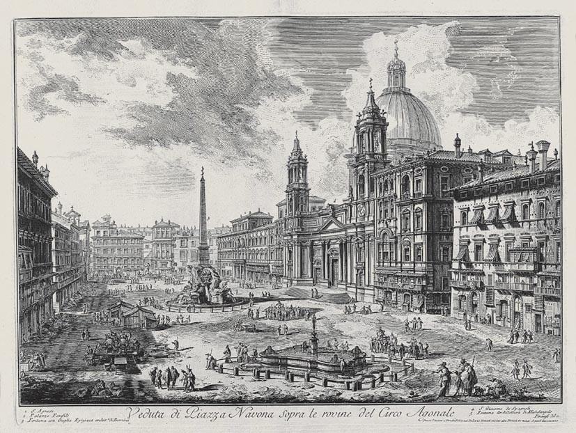 Con il suo linguaggio artistico audace e inconfondibile l’artista veneto aveva raffigurato i monumenti antichi e classici della Città Eterna in 135 fogli. Fedelmente, ma con tratto drammatico, il “Rembrandt delle rovine” (lo definisce così Giovanni Ludovico Bianconi 1779 nella biografia Elogio storico del Cavalier Giambattista Piranesi), rappresenta monumenti romani antichi, come gli archi trionfali o Castel Sant’Angelo, con una passione tale da restituire anima alle cose morte. Scorci da vicino, tagli diagonali, ombre pronunciate, cieli mossi e tonalità raffinate. Il decadimento delle rovine romane facilita la loro collocazione nel paesaggio che le circonda. Piranesi ce le mostra come avvolte nella vegetazione, popolate di figure fantasmagoriche e, nel contempo, immerse nell’aria e nella luce. Piazza del Popolo, il Colosseo, Piazza Navona, Piazza S. Pietro – oggi come ieri le copie e ristampe della serie realizzata tra il 1747 e il 1778 sono un souvenir molto popolare.