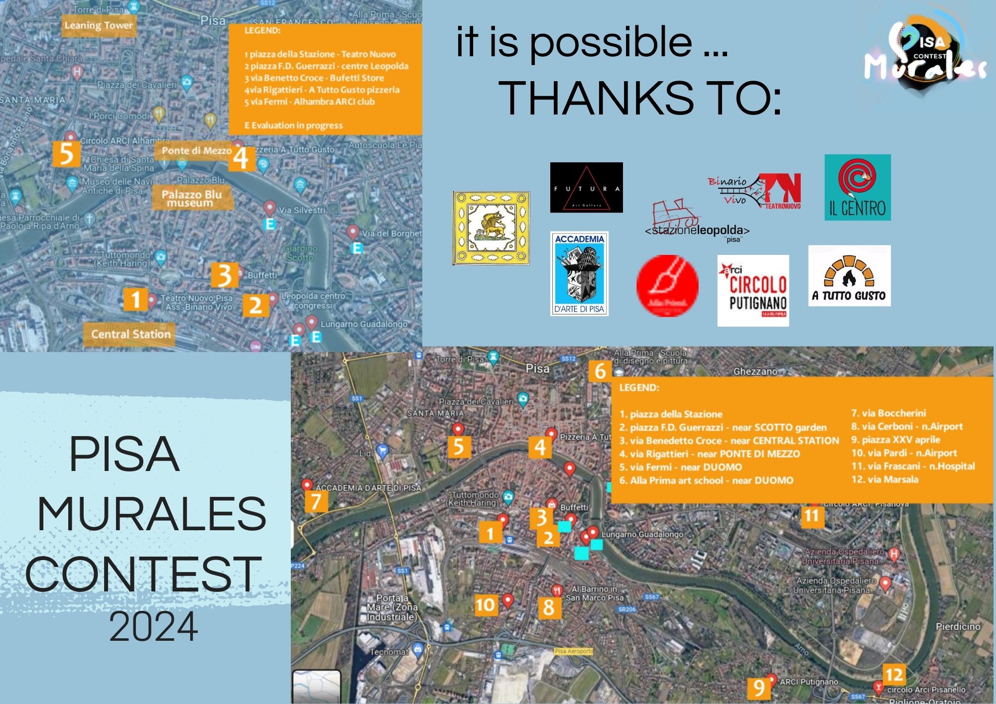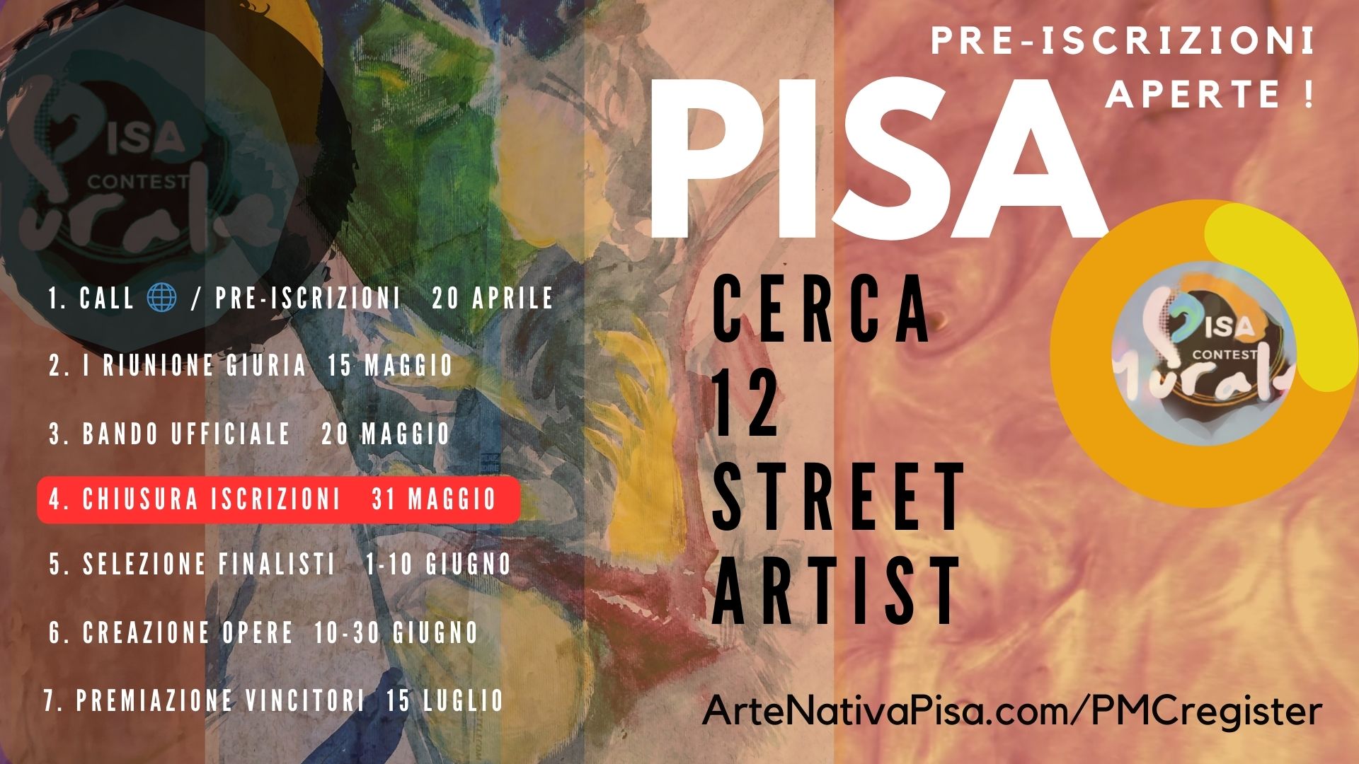 Concorso mette in palio 12 superfici 3 x 4 mt nelle 12 location diffuse su tutta la città nei punti strategici (piazza della Stazione, piazza Guerrazzi, via Rigattieri, via Fermi, San Marco, Pisanova, S.Piero, Putignano e altri) + premi in denaro. Per partecipare: artenativapisa.com/PMCregister