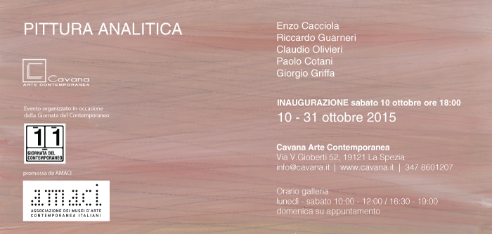 In occasione della undicesima Giornata del Contemporaneo indetta da AMACI, il 10 ottobre 2015, Cavana Arte Contemporanea, propone una mostra sulla Pittura Analitica, una rassegna di artisti con cui la Galleria lavora da diversi anni.
