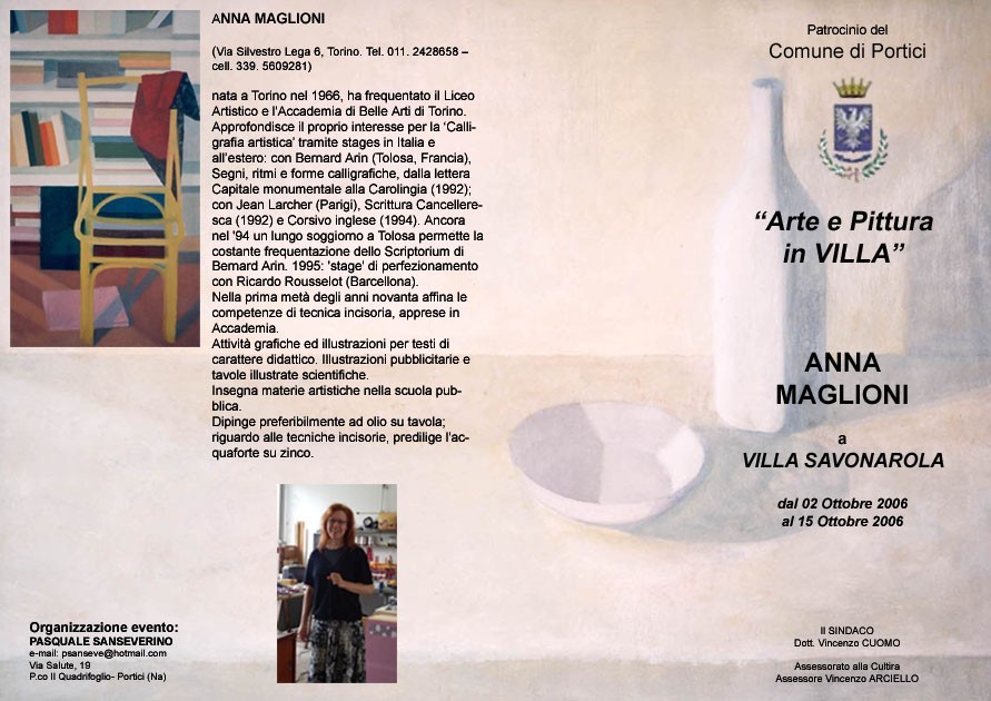 La lieve arte di Anna Maglioni è protagonista di una stagione creativa felice, esuberante e allo stesso tempo intimista. In questi ultimi lavori il segno maturo, il disegno compito eppure libero da sovrastrutture formali, i toni sensuali di un calore solare pervadono ogni aspetto dei dipinti, lasciando intravedere un carattere genuino e dolce, riservato ma comunicativo. L'artista 'parla' con le sue creature, nature morte di oggetti, fiori e frutti dalla struttura formale equilibrata e armoniosa, che ben si inseriscono in un percorso di sperimentazione consolidata con il colore e l'uso della luce. Anche il contrasto tonale, caldo e freddo che gioca con ombre, tagli di luce e chiaroscuri rende vive le composizioni amorevolmente descritte, plasmate, fermate in un respiro immortale. L'arte è anche e soprattutto questo: memoria indelebile, testimonianza emozionale, presenza spirituale e in Anna Maglioni la natura diventa simbolo di interiorità e rispetto per la creazione, indagata nei suoi aspetti più familiari, perciò più amati.