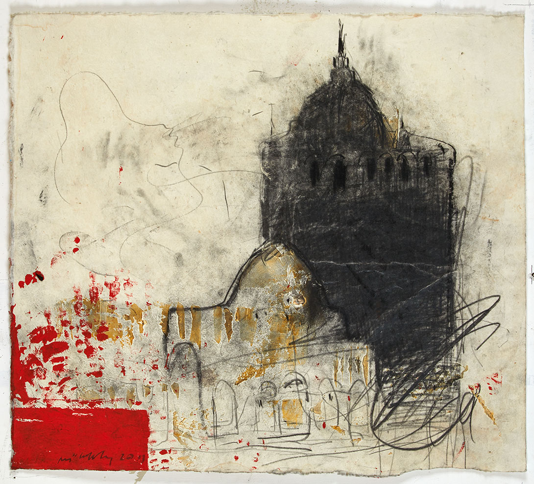Una mostra solo di carte che gioca con gli equilibri e la ricerca del tratto pittorico più adagiato e poi più veloce; della sfumatura acquosa dei colori, del rosso, dell’azzurro più vividi e poi dei neri più profondi e dolenti; degli oggetti lasciati nel vuoto, dei non finiti, del tentativo di tenere tra le mani il tempo e lo spazio attraverso le architetture e le mappe.