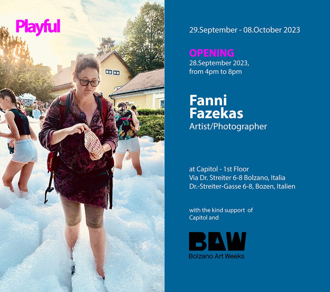 Fanni Fazekas frequenta da anni fiere d'arte e cene dove fotografa il pubblico e l'atmosfera dell'evento artistico, gioca e scherza con gallerist*, collezionist* e artist*. In totale contrasto, ci presenta immagini di bambin* allo schiuma party a Rácalmás (Ungheria). Lì, Fazekas è stata invitata come artista residente al Magyarországi Alkotótelepek és Symposionok Társasága, ma ha deciso di scattare foto alla festa cittadina invece di andare all'inaugurazione della mostra.