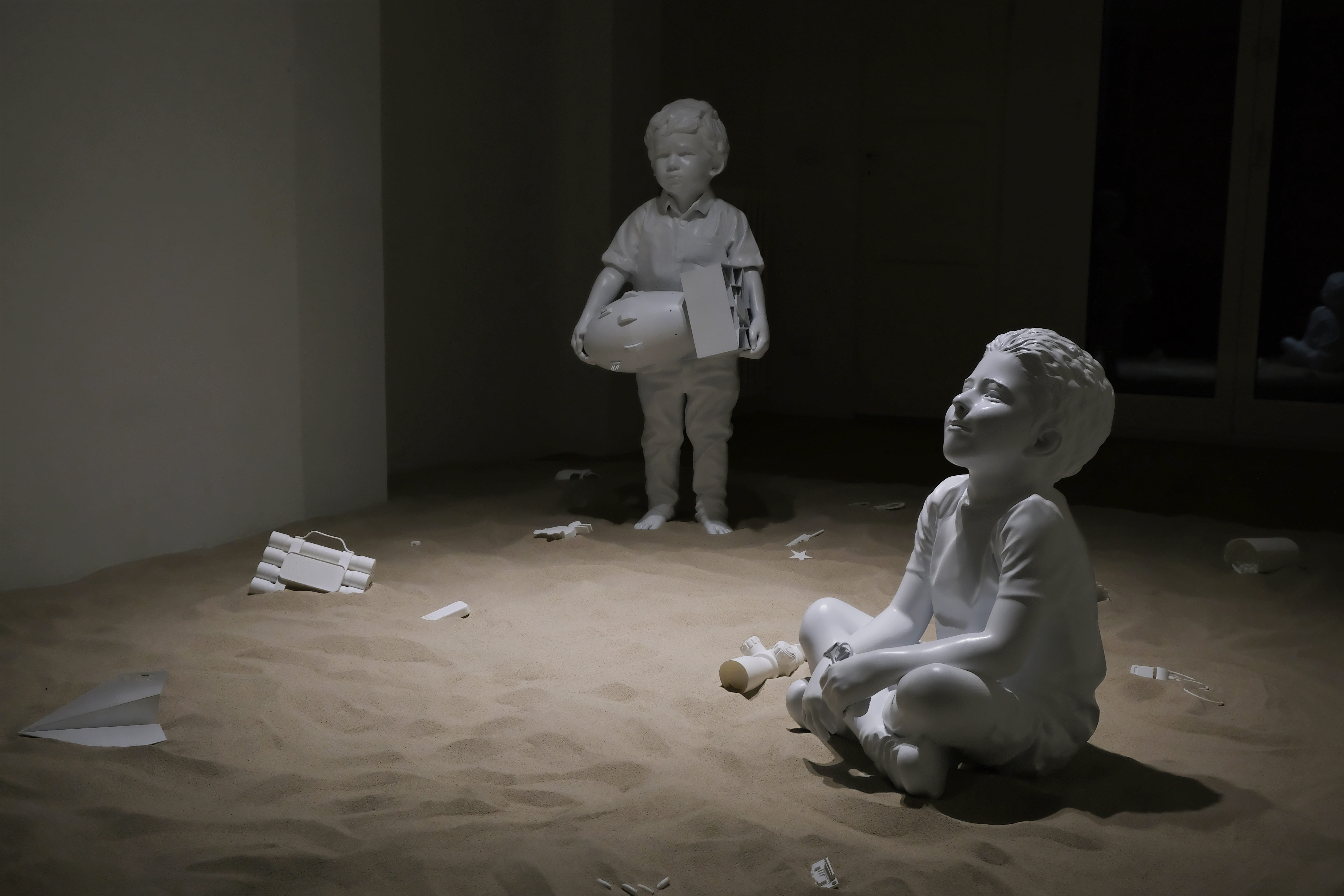 I bambini protagonisti di Playground sono sculture monocrome, lucide, neutre, circondate da pezzi di armi, tengono in mano delle bombe con una spaventosa tranquillità. La guerra quindi diventa parte dell’infanzia e di un’oscura normalità.