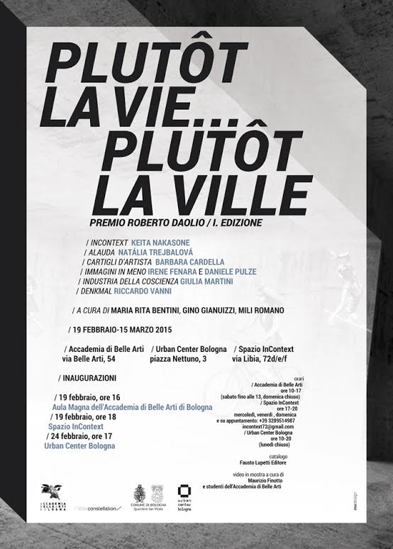 Dopo il bando e la successiva selezione, la prima edizione del Premio Roberto Daolio approda alla presentazione dei progetti premiati e si confronta con il pubblico. Gli eventi espositivi legati al Premo Roberto Daolio “Plutôt la vie… plutôt la ville”* si aprono infatti a Bologna in tre sedi: giovedì 19 febbraio, alle ore 16:00, nell'Aula Magna dell'Accademia di Belle Arti e alle ore 18:00 negli spazi dismessi di via Libia 72d/e/f, nel quartiere San Vitale, sede temporanea del progetto vincitore, per continuare poi martedì 24 febbraio, alle ore 17:00, all'Urban Center. Nelle tre mostre si vedranno sei riflessioni sulla città e relative proposte di intervento: in via Libia troveremo InContext, la realizzazione concreta del progetto di Keita Nakasone, vincitore del primo premio: un progetto di riuso e rivitalizzazione di un luogo dismesso temporaneamente restituito al quartiere e ai suoi cittadini attraverso degli interventi artistici contestuali (mappe, ritratti, interviste e memorie del luogo) realizzati attraverso la partecipazione e il dialogo con gli abitanti del quartiere.