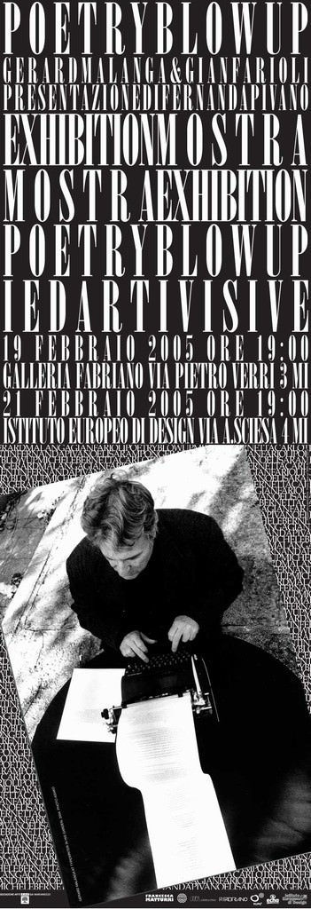 Le poesie di Gerad Malanga, esponente della “Factory” di Andy Warhol, vengono interpretate da Gianfarioli, architetto e designer italiano, attraverso un processo artistico che le traspone in forme bidimensionali e tridimensionali. Interpretazioni che danno vita a un concerto di oggetti in cui il linguaggio diventa forma e in cui i segni della scrittura divengono parte integrante dell’opera d’arte.