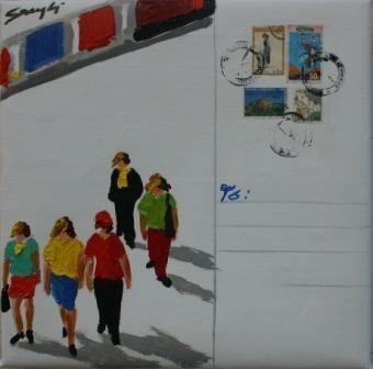 Di veri e propri assemblaggi si tratta quando si parla delle opere di Dino Sambiasi, artista pugliese che trasforma la materia più povera ed inerte –la iuta, i sacchi, vecchi pezzi di cartone- in materia viva, uomini e donne che passano per strada , che riempiono con la loro presenza sgargiante lo spazio del quadro. A distanza ravvicinata si coglie il dettaglio dato dalla scelta e sovrapposizione dei materiali e la bidimensionalità delle figure, ma viste da lontano Le opere di Sambiasi sono estremamente dinamiche e si presentano come una istantanea sul mondo, il mondo creato dall’artista che lo rigenera riutilizzando proprio ciò che quel mondo scarta.