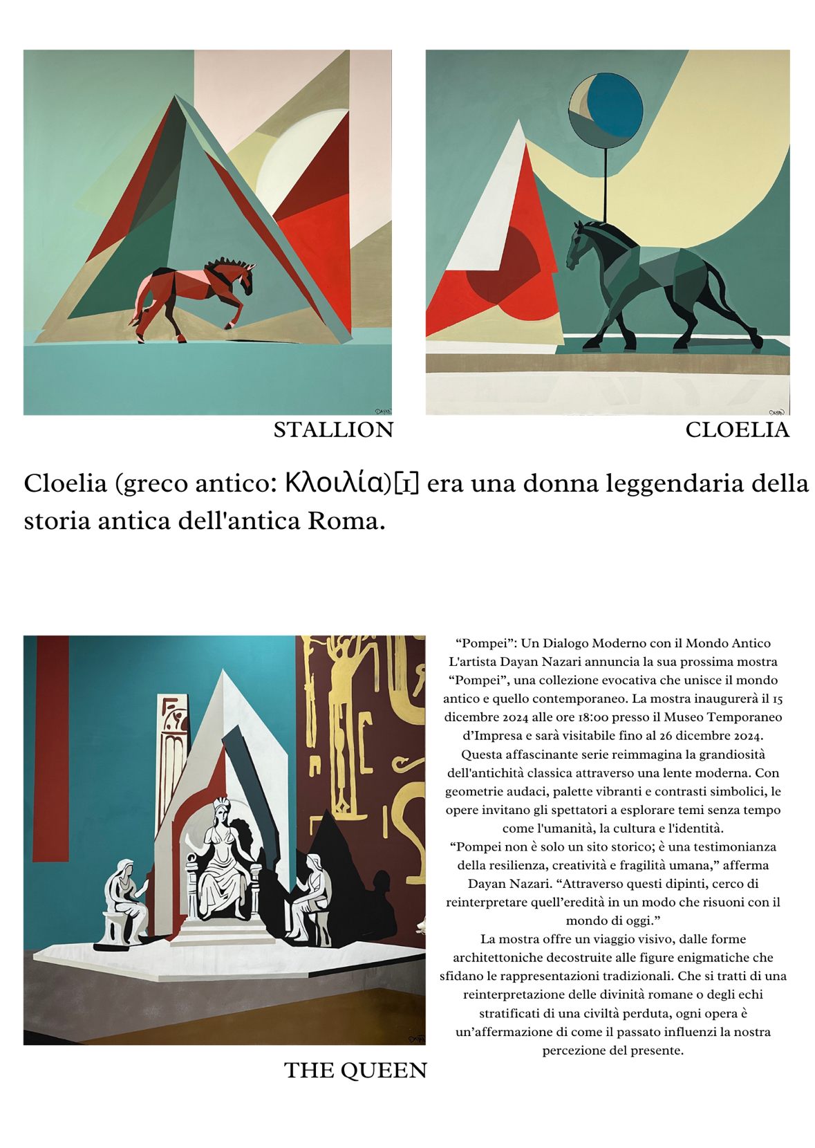 "Pompei", una collezione evocativa che unisce il mondo antico e quello contemporaneo. La mostra inaugurerà il 15 dicembre 2024 alle ore 18:00 presso il Museo Temporaneo d'Impresa e sarà visitabile fino al 26 dicembre 2024.