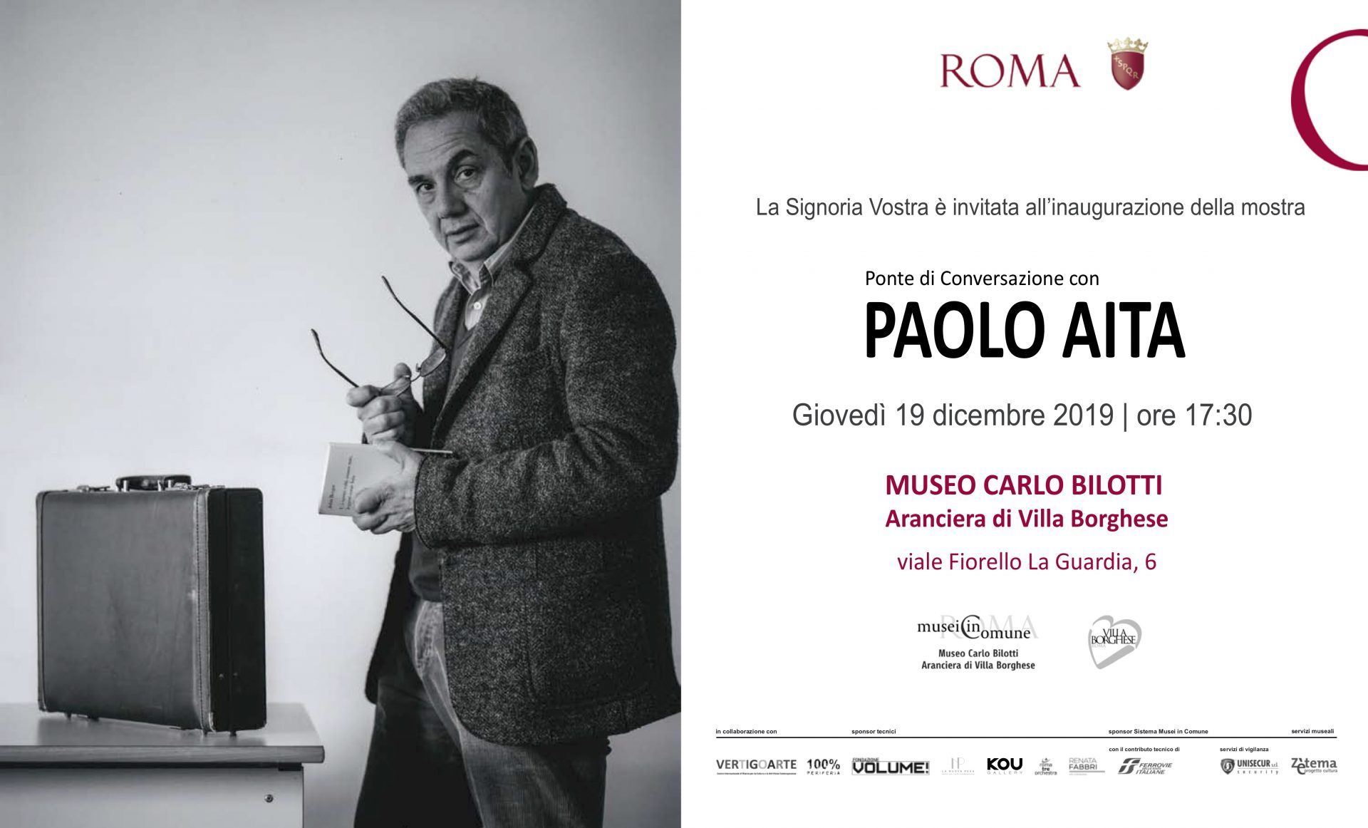 La mostra “Ponte di Conversazione con Paolo Aita” nasce con l’intento di approfondire l’opera di Paolo Aita: poeta, filosofo, letterato, giornalista, redattore di programmi musicali su Radio Vaticana e curatore di mostre. L’esposizione, in programma al Museo Carlo Bilotti - Aranciera di Villa Borghese, dal 20 dicembre 2019 al 23 febbraio 2020, è stata progettata come un unico percorso costituito da poesie e opere d’arte: alcune liriche cinesi del periodo T’ang tradotte in italiano da Paolo Aita – estratte dal suo libro “Dove l’acqua riposa” – saranno associate a 55 opere d’Arte Contemporanea dei numerosi artisti presenti.