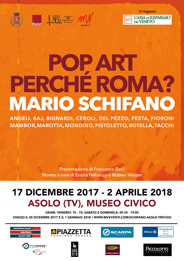 Questo l'incipit della mostra “Pop Art: Perché Roma?” presentata al Museo Civico di Asolo (Tv) dal 17 dicembre 2017 al 2 aprile 2018, excursus sulla Pop Art italiana una delle più emblematiche correnti artistiche della storia del Novecento, capitanata dal genio indiscusso di Mario Schifano con l'obiettivo di far dialogare le opere di arte moderna ospitate nella collezione permanente del Museo Civico con gli smalti grondanti e gli acrilici di un gruppo di ricercatori che venne poi conosciuto come la Scuola romana dell'avanguardia dei pittori “maledetti”.