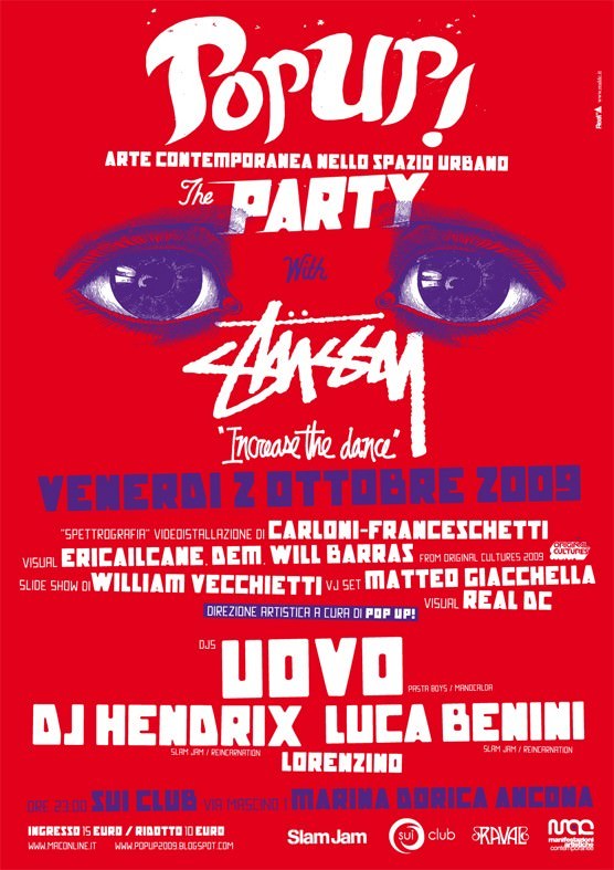 Venerdì 2 Ottobre ore 23.00 il Sui Club ospita POP UP! The Party! with STUSSY increase the dance, il party ufficiale del festival “Pop Up! Arte Contemporanea nello spazio urbano”.