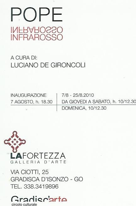 I grandi nomi dell'arte contemporanea concorrono ad incrementare l'ormai consolidato livello qualitativo della Galleria La Fortezza. Questa volta il compito spetta a Pope ( vero nome: Giuseppe Galli), uno tra gli esponenti più creativi di quella Pittura Analitica che tanti consensi ha riscosso sulla scena europea degli anni settanta. A partire da Sabato 7 Agosto l'artista presenterà il frutto più recente della sua sperimentazione cromatica nella cornice dell'esposizione “Infrarosso”. Curata da Luciano DeGironcoli, s'inaugurerà alle 18.30 presso i locali di Via Ciotti, a Gradisca d'Isonzo, per poi rimanere in calendario fino al 25 del mese.