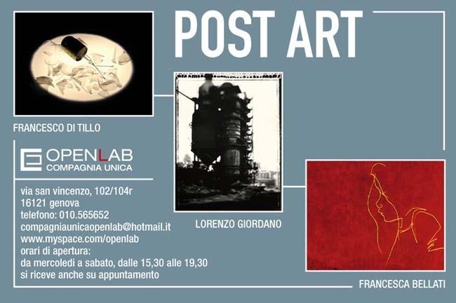 Ancora una volta Open Lab mette in scena tre artisti che ci mostrano i mezzi e gli esiti che l’arte è in grado di esprimere nella contemporaneità. Da antichi resti di chiese e conventi che, una volta recuperati, ospitano centri commerciali e negozi (con spazio espositivo annesso nel caso, più unico che raro, di Compagnia Unica) a ruderi di ex-fabbriche che cambiano destinazione d’uso oppure restano abbandonate al loro degrado: tutti gli elementi dell’arredo urbano, ma anche gli oggetti di scarto o d’uso comune possono divenire fonte d’ispirazione, se non materia stessa per plasmare forme d’arte.