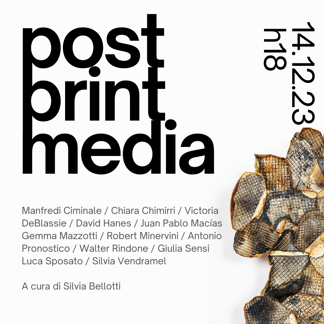 Dodici artisti, diversi per formazione, ricerca ed esiti formali, sono i protagonisti della collettiva Post Print Media, che inaugurerà giovedì 14 dicembre 2023, ore 18, alla Galleria Il Bisonte, via di San Niccolò 24r con lavori di Manfredi Ciminale, Chiara Chimirri, Victoria DeBlassie, David Hanes, Juan Pablo Macías, Gemma Mazzotti, Robert Minervini, Antonio Pronostico, Walter Rindone, Giulia Sensi, Luca Sposato e Silvia Vendramel.