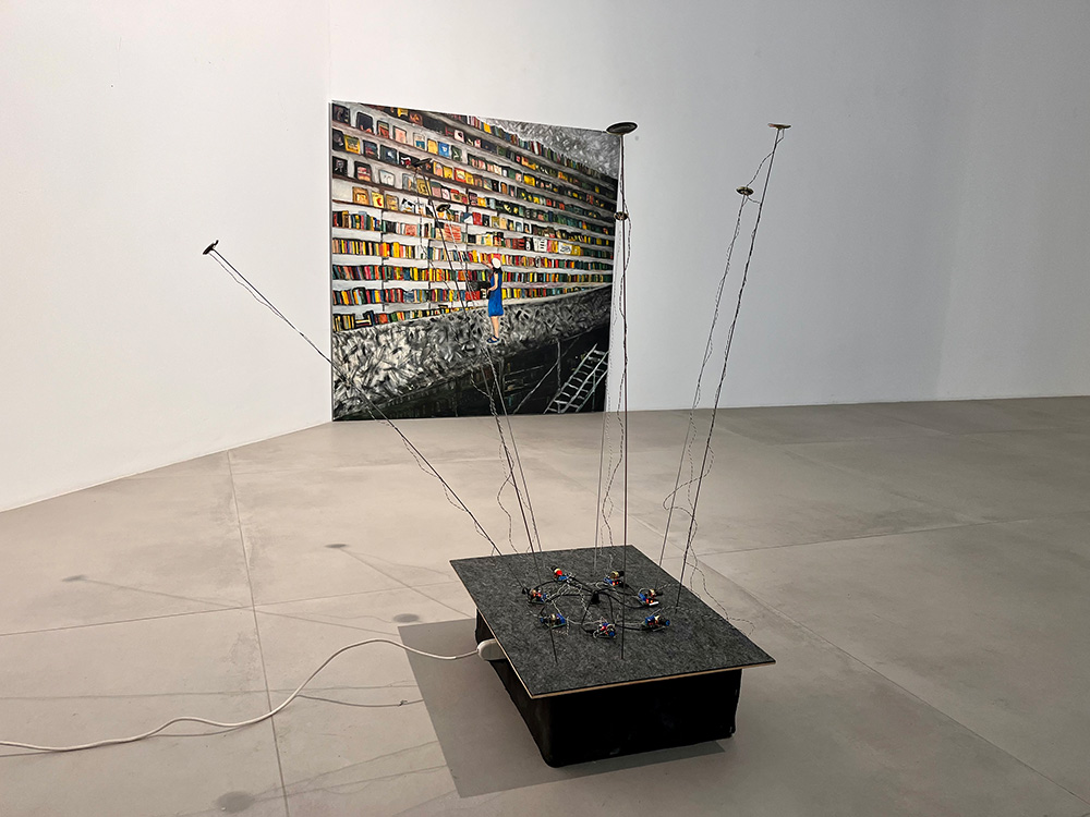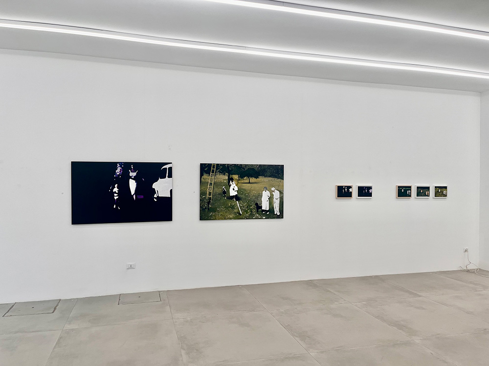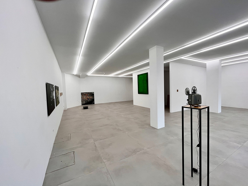Una mostra che si articola in dodici opere disposte con esattezza geometrica sulla scacchiera dello spazio s.l.m. 00, che alternano linguaggi e supporti differenti, con una libertà espressiva che riflette la varietà della ricerca di Giangrandi. Così alle installazioni sonore succedono le stampe dipinte poi ad acrilico, i video stanno accanto ai collage fotografici e le pellicole, lasciando perfino spazio ai linguaggi di programmazione informatica, di cui l’artista da tempo si interessa. A fare da orizzonte per lo sguardo – e contestualmente a fissare le proporzioni espositive – un vecchio proiettore che prende vita con l’avvicinamento dello spettatore. In maniera simile, le opere conterranno dei tag nfc, che consentiranno di ascoltare musica insieme ad ogni opera (si raccomanda di portare delle cuffiette).