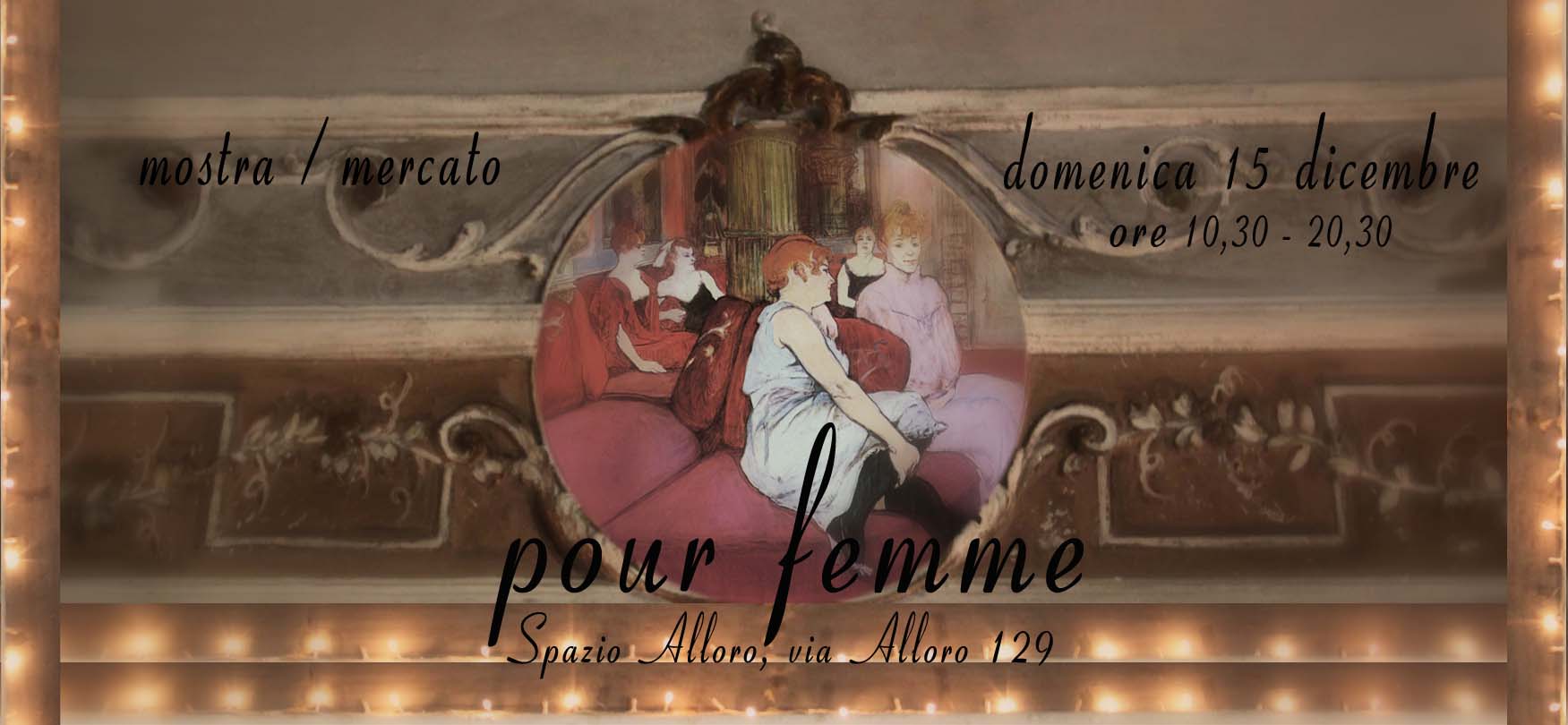 L’atelier mason Spazio Alloro è lieta di invitarvi alla mostra/mercato d’artigianato artistico POUR FEMME che si effettuerà Domenica 15 Dicembre dalle 10,30 alle 20,30 un intero giorno da trascorrere insieme all’insegna della creatività d’artista proponendovi nuove ed uniche idee regalo e per gli estimatori del genere una sezione dedicata al vintage .