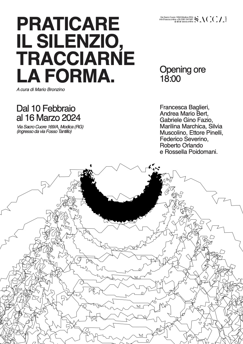 Inaugura sabato 10 febbraio alle ore 18.30 presso la Galleria SACCA di Giovanni Scucces a Modica (RG) in via Sacro Cuore 169/A “Praticare il silenzio, tracciarne la forma”, una mostra curata da Mario Bronzino con opere di nove artisti, che in modi differenti hanno avuto un rapporto diretto con il territorio in cui sorge la galleria.