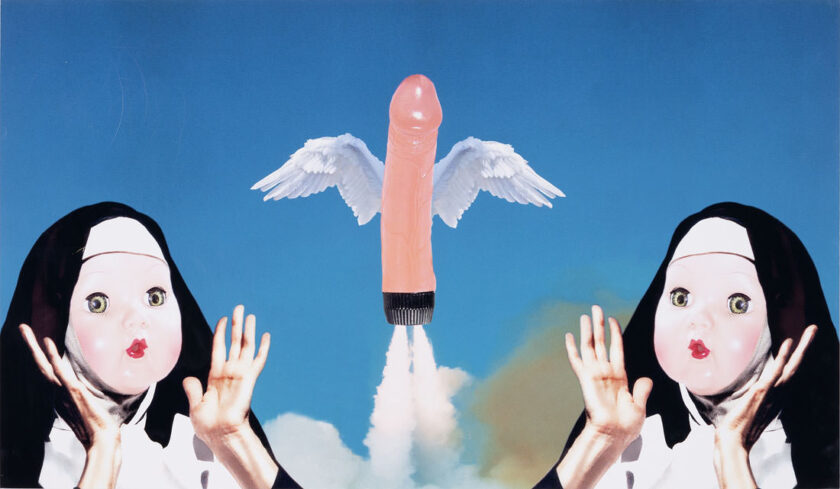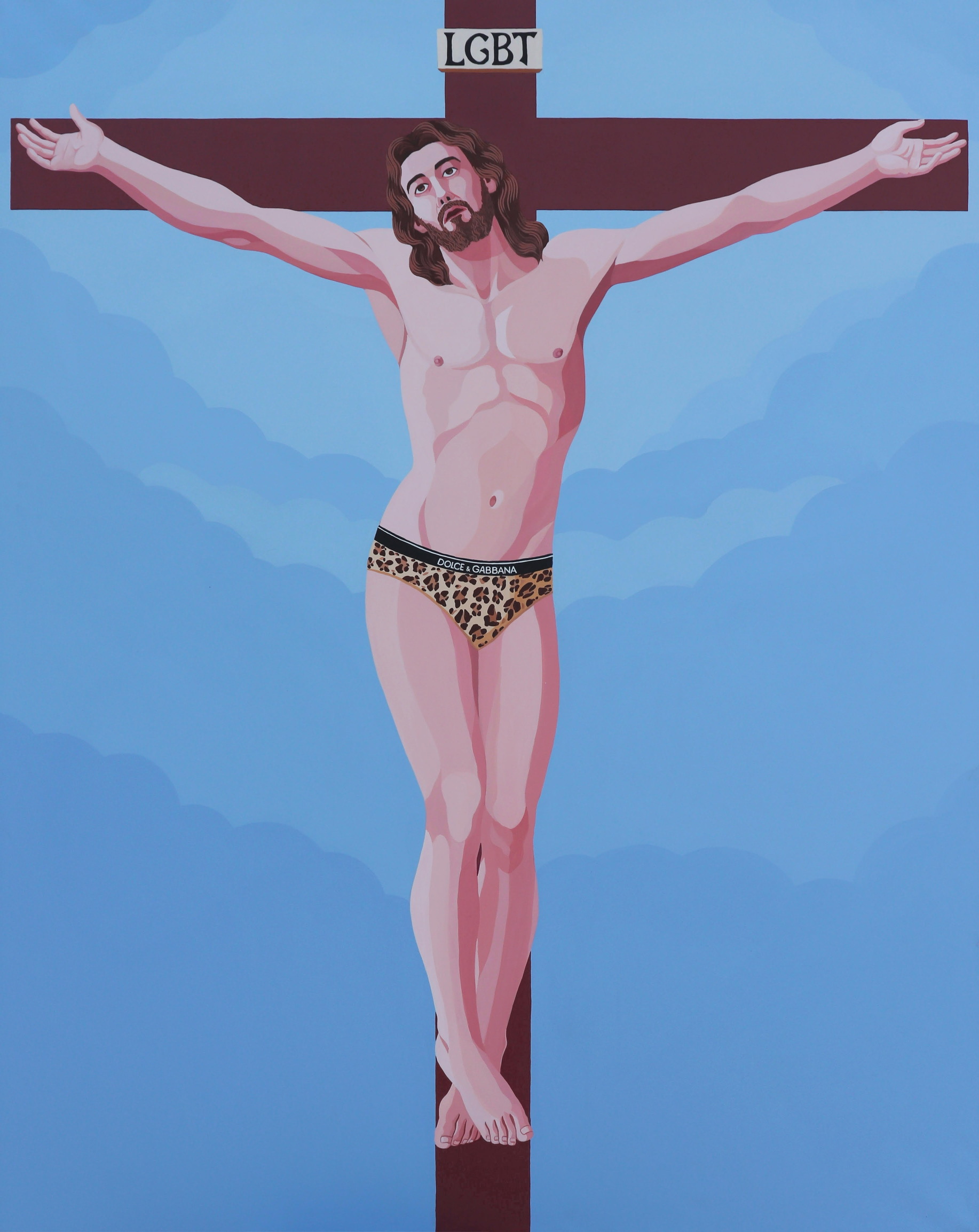 Ventidue artisti hanno affrontato il tema in modo diverso, con serietà o con ironia, attraverso quadri, fotografie, installazioni, sculture, performance. Ecco allora, tra le altre opere, il Cristo LGBT di Giuseppe Veneziano, gli straordinari “gioielli” e le spade digitali di Mataro da Vergato create con silhouettes di uomini nudi, baci gay e lesbici, come quelli di Max Ferrigno e di Felipe Cardeña, le esilaranti scene di un futuro distopico di Max Papeschi, i ritratti “resistenti” di Florencia Martinez scattati al Pride 2023 di giovani con gli occhi chiusi in segno di protesta contro ogni discriminazione; e poi i tableaux vivants di Francesco de Molfetta x Federico Laddaga ispirati ai capolavori del passato, il Cupido LGBTQ+ di Stefano Banfi, le sculture falliche di Sara Forte, le pussy ricamate di Carla Mura o quella al LED di Alessandro Manvanti, le foto di giovani dalla sessualità fluida di Elena Ovecina, e ancora le spogliarelliste fluide di Anna Muzi, i piccoli racconti sul tema dei diritti di Gabriella Kuruvilla, gli ermafroditi di Dario Arcidiacono… ancora, i collages pittorici dal sapore punk di Leone Solia, i provocatori quadri di Andrea Saltini, quelli giocosi e “superflat” di Tomoko Nagao, che alludono alla sessualità in maniera ironica, con un occhio al pop e uno all’estetica manga. Federico Crespi gioca con gli stereotipi alludendo alla sessualità presente ovunque, persino nel cibo, mentre Ambra Grande eseguirà una performance dedicata al corpo e alla sessualità.