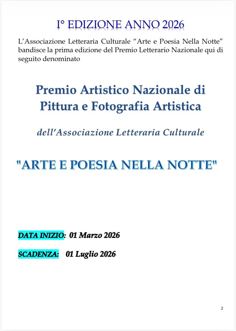 L’Associazione Letteraria Culturale “Arte e Poesia Nella Notte” bandisce la prima edizione del Premio Letterario Nazionale qui di seguito denominato