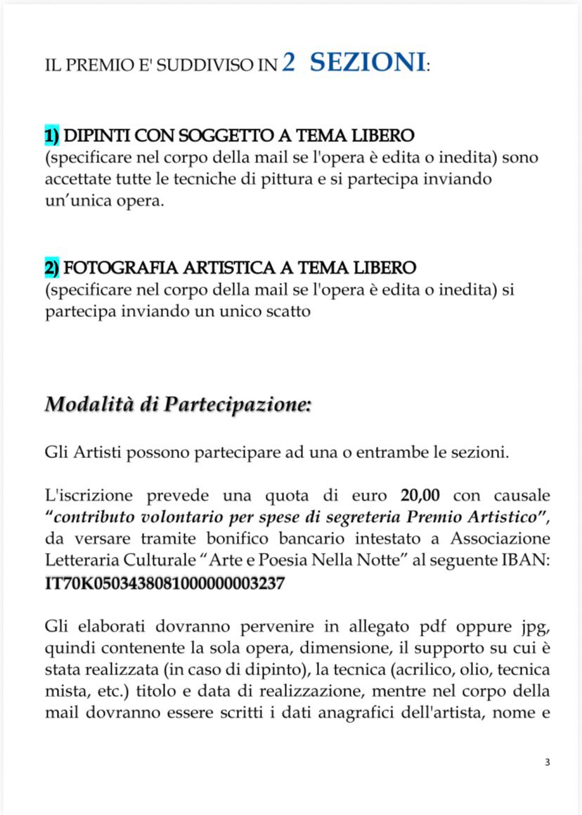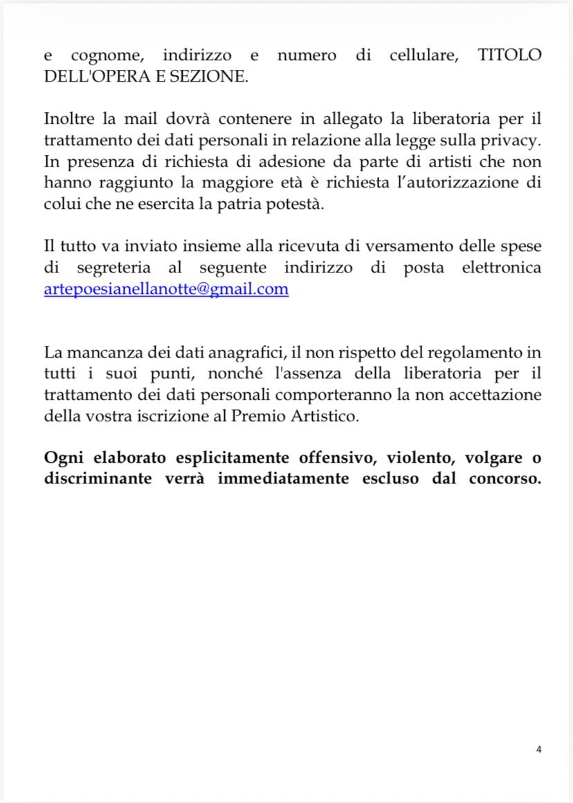 Il tutto va inviato insieme alla ricevuta di versamento delle spese di segreteria al seguente indirizzo di posta elettronica artepoesianellanotte@gmail.com