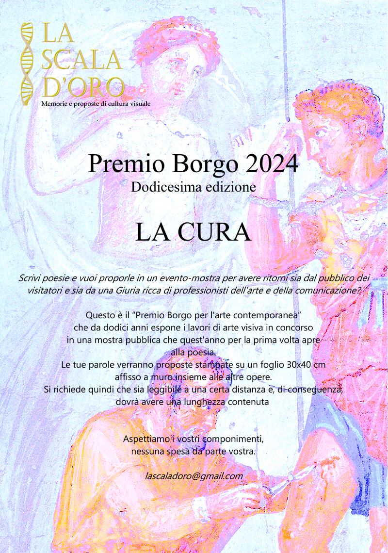 Per la prima volta sul web, alla dodicesima edizione, domani in giornata verranno dichiarate le due opere vincitrici del Premio Borgo 2024. Ventisette partecipanti, di questi undici italiani, due russi e i rimanenti attivi a Berlino (Germania). L'iniziativa si conclude nel 2025, con una mostra personale dell'autore che ha realizzato l'opera vincente e la cura di un evento di proiezione per il vincitore del settore video. Ad oggi gli artisti favoriti, perché in vantaggio nella raccolta dei consensi della Giuria, sono Svetlana Gushchina (Russia) per il settore arti figurative e Maria Korporal (Germania) per il settore video.