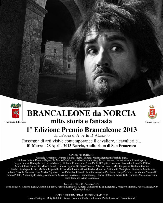 Venerdì primo Marzo alle ore 17,30 prende il via a Norcia la mostra “Brancaleone da Norcia - mito, storia e fantasia”, nella stupenda cornice dell’auditorium di San Francesco. Una selezione di artisti provenienti da tutta Italia, hanno creato lasciandosi ispirare dalle soggezioni che emana Brancaleone da Norcia personaggio mitico interpretato per ben due volte da Vittorio Gassman e diretto Mario Monicelli. Ce ne parla Alberto D’Atanasio che del premio e della mostra ne è l’ideatore. Questo premio nasce con lo scopo di ricordare e dare un riconoscimento a quanti nel cinema, nel teatro e nello spettacolo in genere hanno lasciato un segno indelebile e un patrimonio di valore incalcolabile fatto di sana ironia, di allegria, di spensieratezza e di sogni che ci hanno fatto più leggero il vivere. Monicelli, Vittorio Gassman e gli sceneggiatori, Age e Scarpelli hanno segnato un’epoca e cambiato il modo di fare cinema, trasmutando la narrazione storica in commedia. Questo primo evento vuole essere semplicemente un modo per rievocare e fare festa. Ed è una festa che è già riuscita perché gli artisti hanno permesso all’idea di diventare forma, colore immagine ed è straordinario, vedere le austere mura dell’ex chiesa di San Francesco ora adibita ad auditorium tingersi dei colori delle opere esposte, Venerdì, continua D’Atanasio, interverranno tre musici, Angelo De Domenico (Violino, Mandolino e direzione artistica), Flavio Ghetti (Chitarra e Liuto), Lucio Aleo (Tamburello Basco e Tamburo del Bongo) che eseguiranno musiche tardo medievali e rinascimentali.