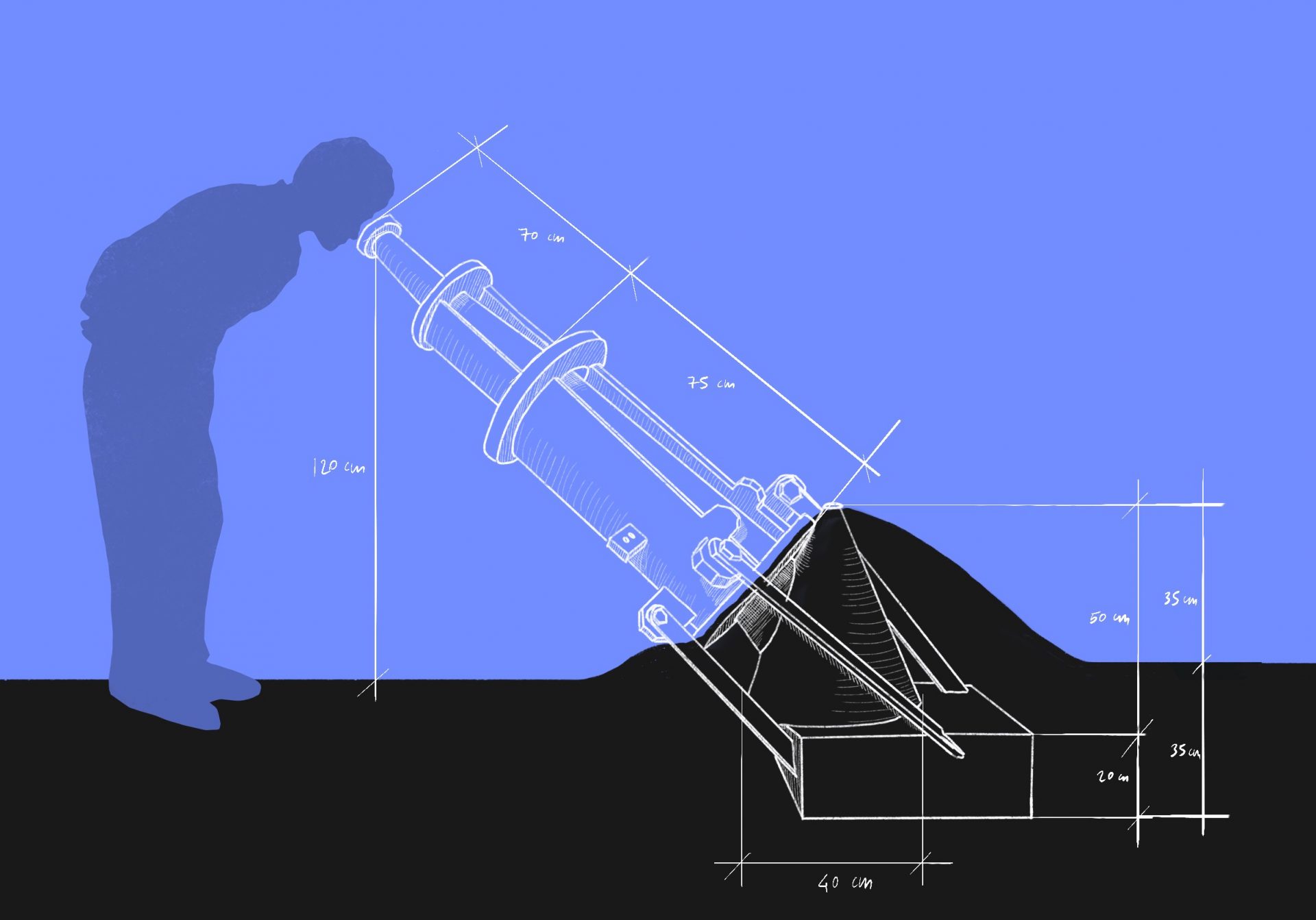 Il telescopio sarà realizzato interamente in acciaio inox utilizzando il pezzo meccanico FINISHED BEARING BRACKET GRANDE ed imitandone anche la colorazione. Questo elemento costituirà la colonna/contenitore di tutto il telescopio assolvendo alla sua naturale funzione di sostegno. Il telescopio sarà ancorato al terreno grazie ad un plinto in cemento. La proiezione del cielo sul terreno sarà possibile grazie all’utilizzo del principio della camera stenopeica, che, creando uno spazio completamente oscurato con un foro delle giuste dimensioni, permette di proiettare l’immagine di ciò che si trova dall’altro lato del foro, in questo caso il cielo.