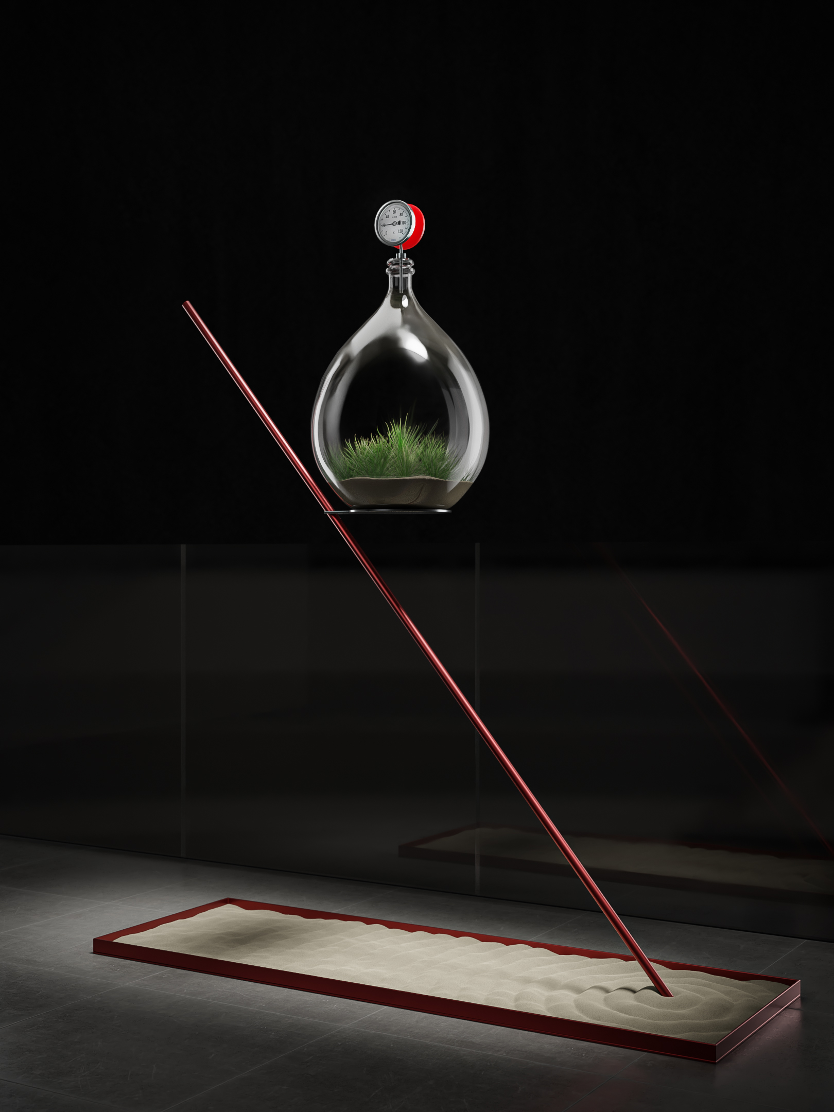 A red spot (Davide Iotti) presenta un lavoro molto raffinato, dal titolo Sospeso. Lo strumento di misurazione (termometro) esercita un sistema di controllo e salvaguardia di un ecosistema da preservare: una sfera di vetro, in sospensione al centro della composizione dove risiede la Tillandsia, pianta molto particolare che vive senza terra e con pochissima acqua nebulizzata. E infine la sabbia (elemento di disturbo nei sistemi di pompaggio), inserita alla base del micromondo.
