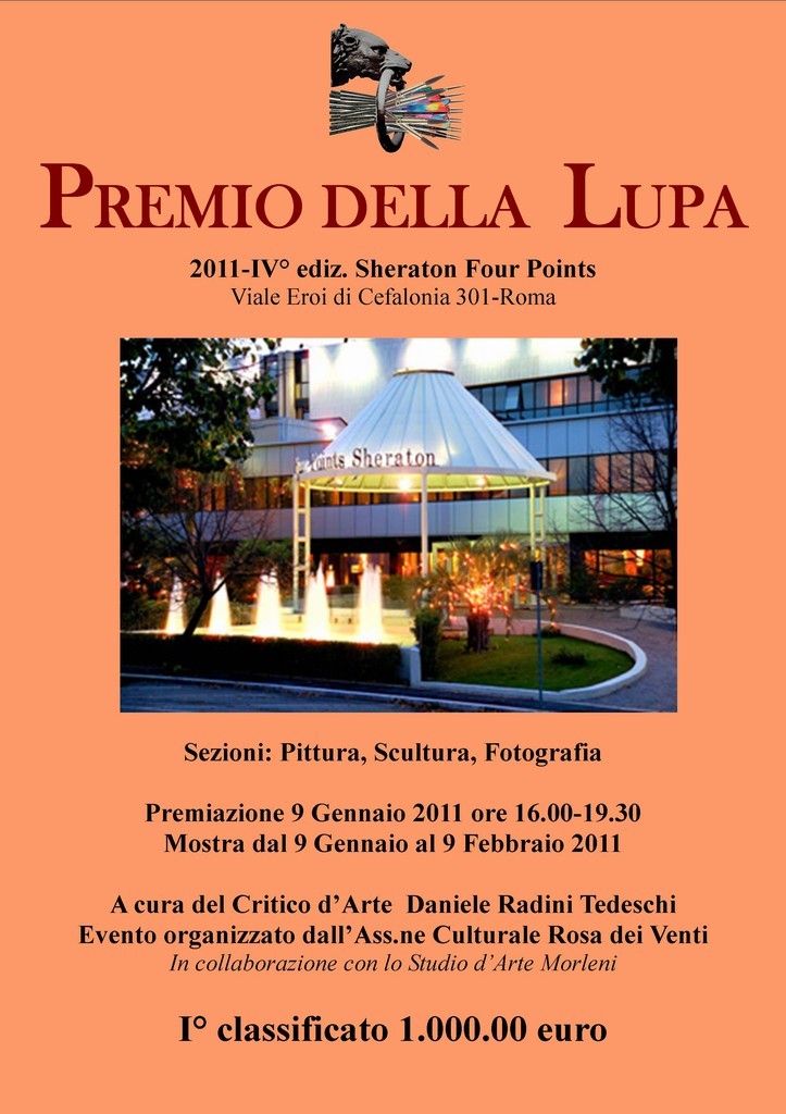 Il 9 Gennaio 2010 alle ore 16.00 si inaugura, presso lo Sheraton Four Points, la IV Edizione del premio della Lupa; un appuntamento fisso ormai da quattro anni che riscuote numerosi consensi e plusi nel mondo dell’arte. Il riconoscimento oltre a richiamare la romanità raccoglie quest’anno anche artisti internazionali. Ad impreziosire una location lussuosa e confortevole vi saranno quadri, sculture e fotografie di circa sessanta partecipanti. La mostra, di durata un mese, inizierà alle ore 16.00 con un susseguirsi di convegni scientifici, presentazione di libri fino alla tanto attesa cerimonia di premiazione con, in palio, un premio di mille euro. Nella giuria noti galleristi, storici dell’arte e docenti universitari; a presiederla il celebre Conte Daniele Radini Tedeschi, ospite della serata, che presenterà il suo ultimo libro monografico sul pittore “Sodoma”. L’evento d’apertura del nuovo anno annuncia un ulteriore successo per l’Ass.ne Culturale Rosa dei Venti, promotrice e organizzatrice.