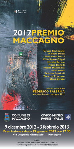 Contestuale al Premio e con allestimento attiguo, si svolge la mostra personale dedicata a Federico Palerma, affermatosi vincitore nell’edizione Premio Maccagno 2011. Strutturata con opere di ampio respiro, la mostra traccia un incisivo profilo del lavoro e della maturità di Palerma.