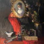 In Zhenhuan Liu, ammiriamo l'infermiera al servizio della comunità, che a sua volta rappresenta la comunità dei medici e degli infermieri, al quale tutto il mondo oggi deve moltissimo. L'opera è fortemente materica, le pennellate sono dense e spesse, creando un emozionante gioco di volumi che accresce la forza e il significato del lavoro. In April 2020, l'artista si ritrae mentre lavora per il suo pubblico e si offre al nostro sguardo. La mascherina abbassata per vedere il suo volto denota il momento storico in cui l'opera viene eseguita. Intorno gli oggetti cari: i fiori, le macchine fotografiche, un cellulare, a indicare il rimpianto per la comunità perduta. Il drappo rosso acuisce l'elegante teatralità della scena.