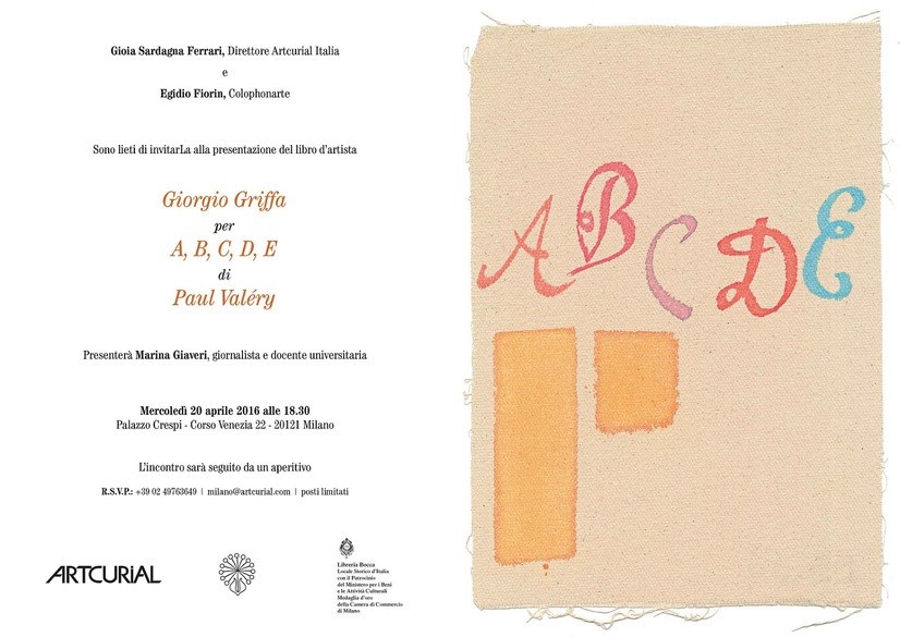 Mercoledì 20 aprile 2016, dalle ore 18.30, Marina Giaveri, docente dell’Università degli Studi di Torino e membro dell’Accademia delle Scienze di Torino, insieme a Egidio Fiorin, direttore e fondatore di Colophonarte, presenta il libro d’artista di Giorgio Griffa, “A, B, C, D, E” dedicato agli omonimi componimenti di Paul Valéry (1871 – 1945), per il quale ha curato le traduzioni inedite dopo aver riportato alla luce il progetto editoriale mai compiuto dal poeta francese