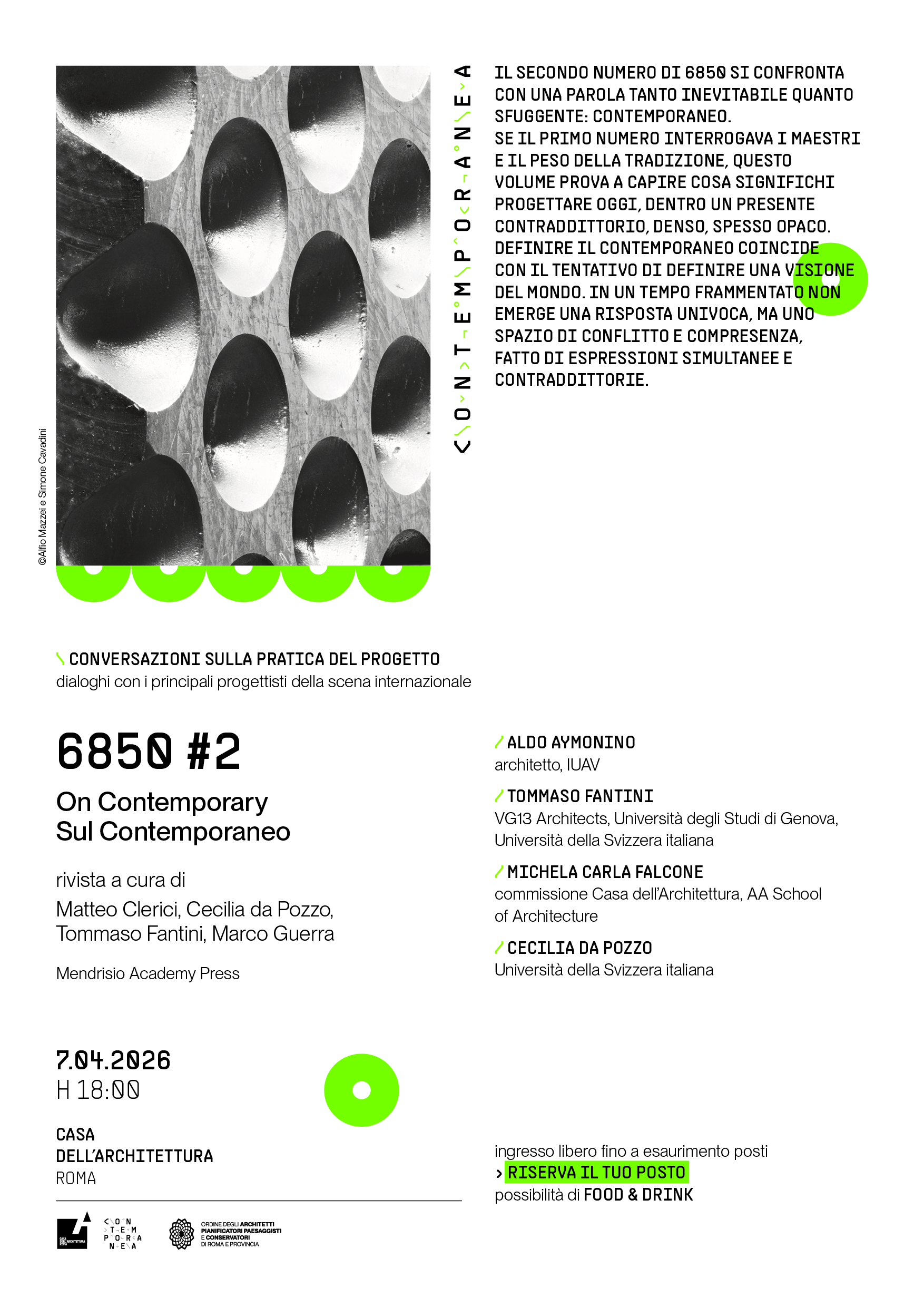 In occasione della presentazione del secondo numero della rivista 6850 a cura di Matteo Clerici, Cecilia da Pozzo, Tommaso Fantini, Marco Guerra, la Casa dell’Architettura propone un incontro dedicato al tema del contemporaneo.