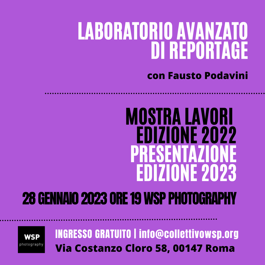 Sabato 28 gennaio alle ore 19:00 si svolgerà una serata dedicata al Laboratorio avanzato di reportage, il nostro percorso di alta formazione nel reportage a cura di Fausto Podavini. Nel corso della serata saranno presentati i progetti realizzati dai partecipanti all’edizione 2022.