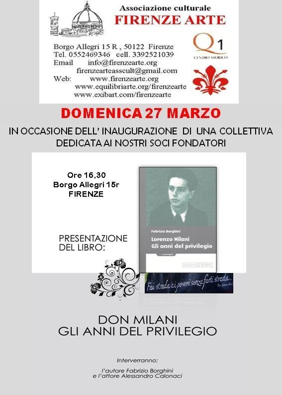 L’inaugurazione di questa collettiva dedicata ai Soci Fondatori dell’Associazione, avverrà assieme alla presentazione del Libro ” Don Milani gli anni del privilegio” a cura del dr. Fabrizio Borghini con la partecipazione dell’attore Alessandro Calonaci.