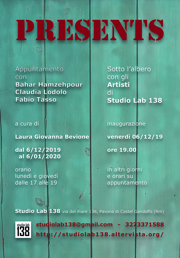 Vincitori di concorsi e residenze, Bahar Hamzehpour, Claudia Lodolo e Fabio Tasso, sono stati scelti e selezionati, per questa mostra, tra gli oltre ottanta artisti presenti sul sito di Studio Lab 138, perché autori di opere d’Arte Contemporanea, frutto di una ricerca e di una poetica forte e chiara. In mostra opere realizzate con medium e tecniche differenti, per offrire un’ampia panoramica sul loro lavoro
