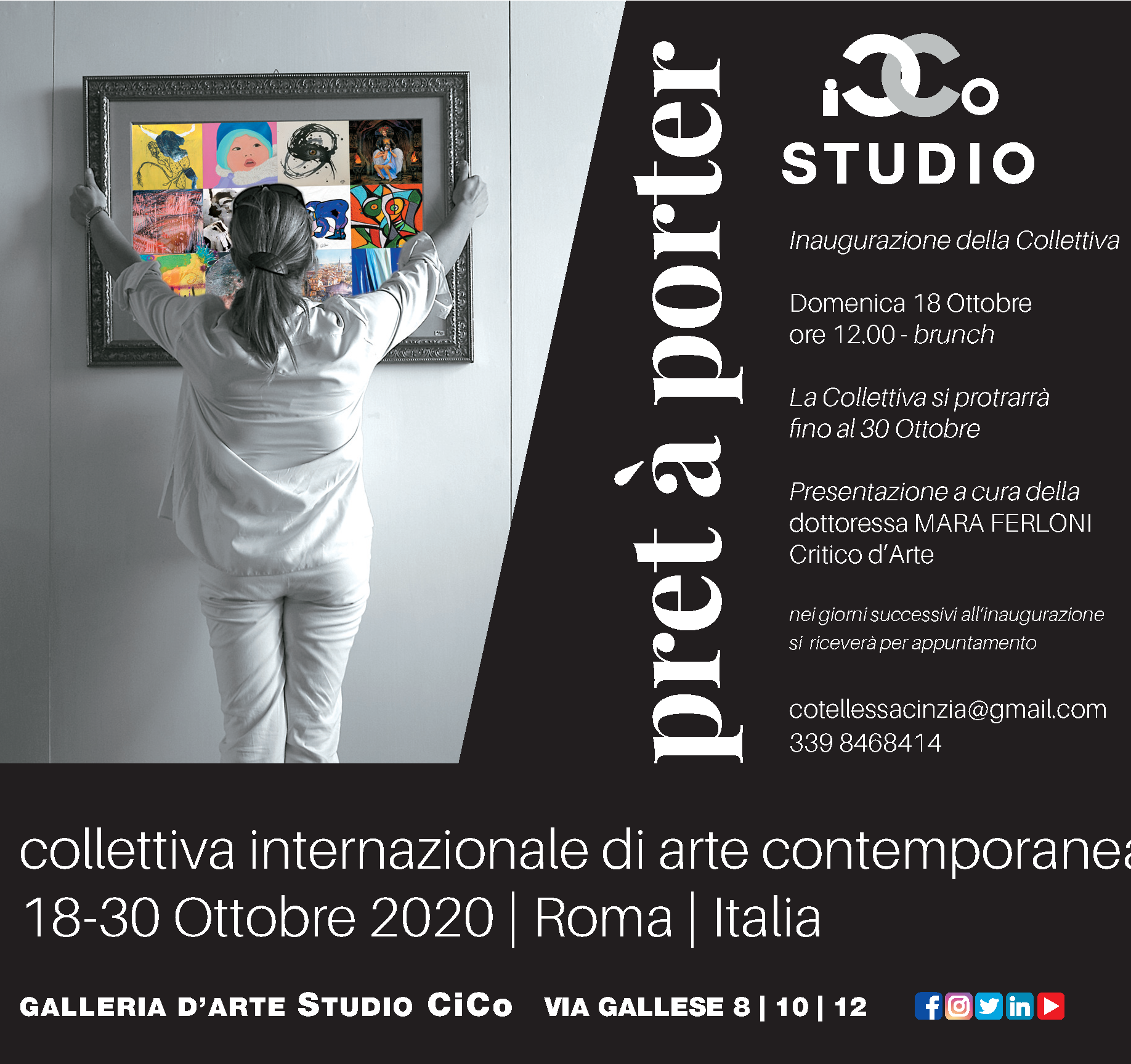 Domenica 18 ottobre alle ore 12,00 la Galleria Studio CiCo inaugura una mostra Collettiva Internazionale dal titolo pret a porter dove saranno esposte opere inedite di Artisti provenienti da 3 continenti, eseguite nell’ultimo periodo del loro percorso artistico. La mostra sarà presentata dal critico d’ arte dott.ssa Mara Ferloni e curata da Cinzia Cotellessa e Giuseppe Zumbolo. Gli Artisti che esporranno a pret a porter sono: Arman-Angelucci-Bacci-Bosio-Brancia-Brunetti-Calza-Camilleri-Corbut-Cremonesi-Dal Bo-De Ponti-Francesconi-Frati-Florio Hacker-Fusar Poli-Khasiev-Lera-Marte-Nanì-Ogliari-Orazi-Premoli-Romanello-Roro-Tavcar-Uber-Veronese-Vulcanes-Zumbolo.