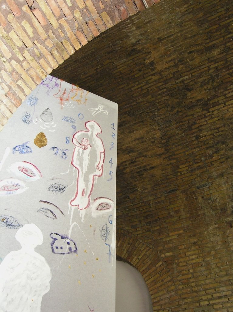 Primarosa Cesarini Sforza ha realizzato una camera della fantasia e della memoria. Lo spettatore sarà avvolto da una figurazione, le cui icone sono ripetute in diverse dimensioni e dipinte con pigmento e luce su teleri che, scendendo dalla volta, trasformano in percorso labirintico il fluido transito nella galleria